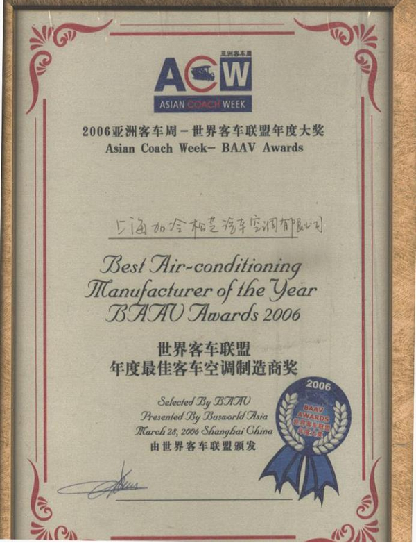 荣获世界客车联盟颁发的“年度最佳客车空调制造商”。